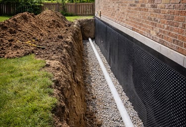 Exterior excavation, membrane installation, and drainage systems.